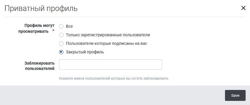Плагин позволяет пользователю закрыть свой профиль от гостей или сделать его приватным, а также заблокировать доступ для определенных пользователей.